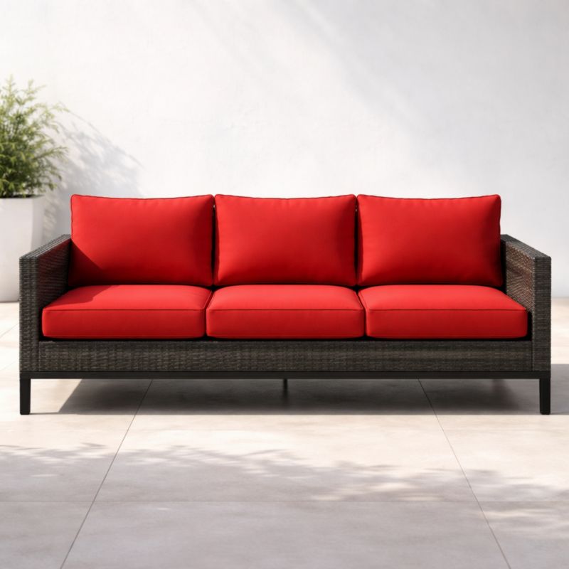 Canapé d'extérieur trois places avec structure en résine tressée et coussins d'assise amovibles en polyester rouge. Dimensions : 200 cm (L) x 80 cm (l) x 75 cm (H). Structure en acier inoxydable avec coussins en mousse de polyuréthane.