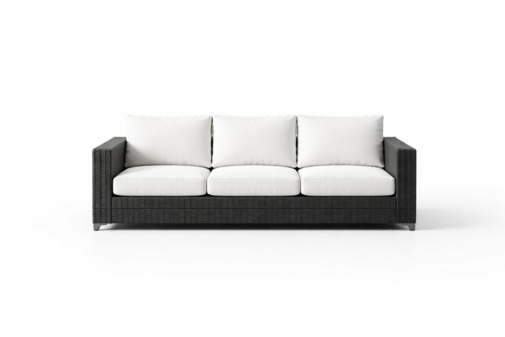 Canapé de jardin trois places en rotin synthétique noir et blanc