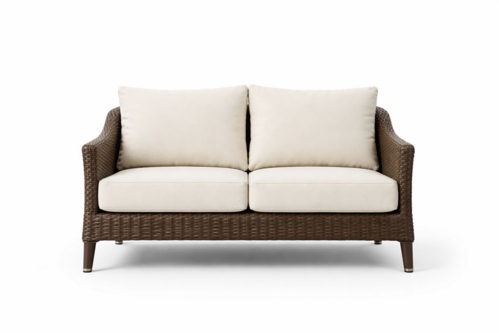 Ce canapé 2 places est conçu en résine tressée. Les coussins sont rembourrés de mousse de polyuréthane et le tissu est en polyester. Les dimensions sont de 125 cm x 75 cm x 80 cm.